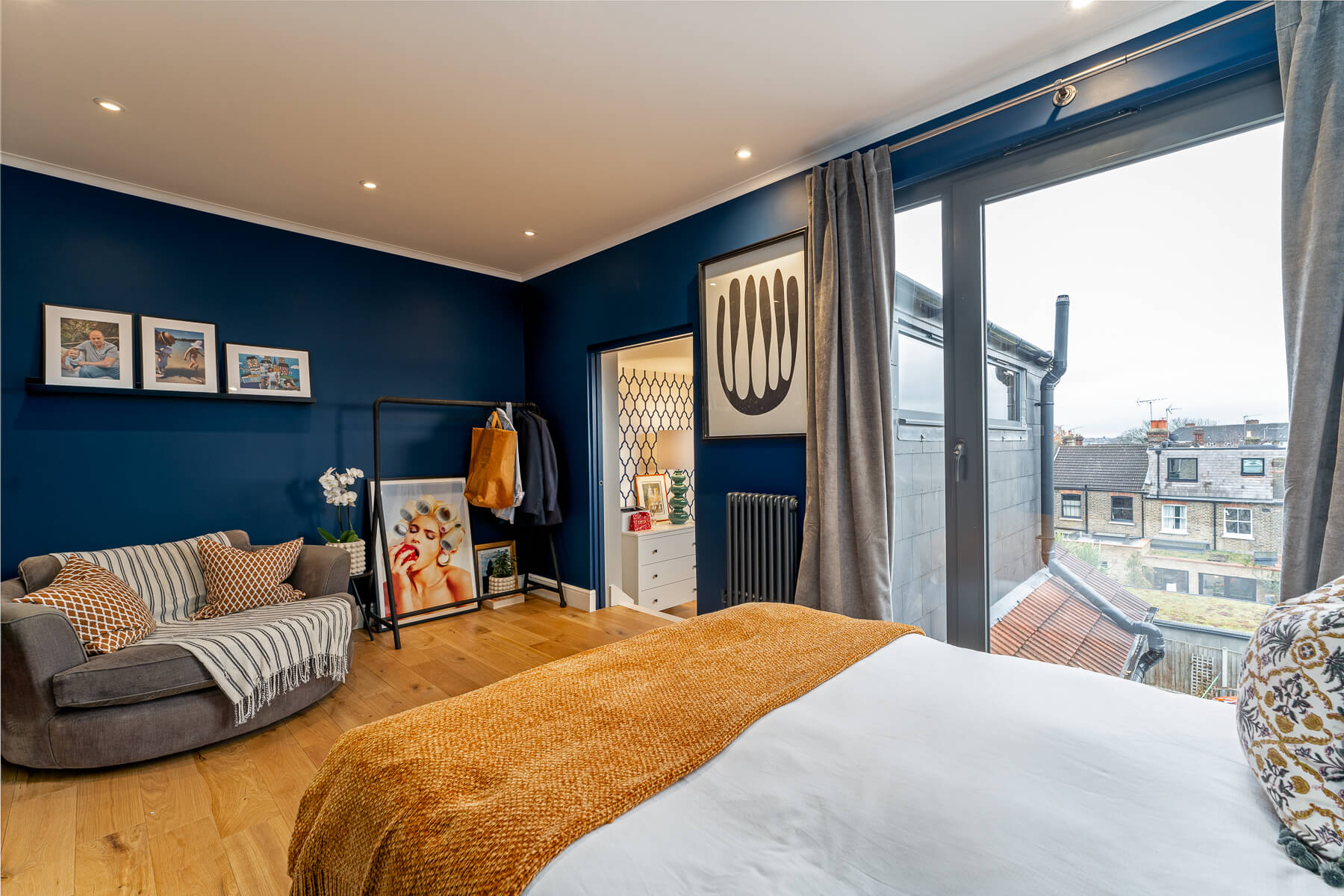 Key features include a full height glazing panel in the bedroom, filling the space with natural light, while the office at the rear showcases an elongated horizontal glazed panel at high level. The outcome is a chic bedroom with a built-in dressing area, a well designed shower room and contemporary home offices.